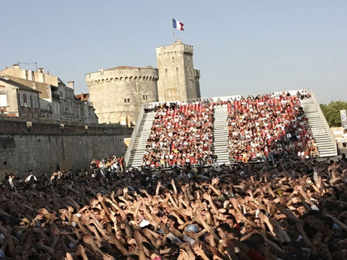 Les artistes les plus populaires se produisent sur la "Grande scène" qui est généralement installée à l' esplanade Saint-Jean D'Acre, en plein air ou bien dans le théâtre le La Coursive juste derrière la place Saint-Jean D' Acre de La Rochelle. Une billet pour les principaux concerts permet habituellement d' assisterà la performance de plusieurs groupes qui jouent les uns après les autres pendant quelques heures. Il est conseillé de réserver ses places dès les mois de mars ou d'avril pour avoir de bonnes chances de choisir son concert.