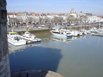 Toujours du même point de vue, mais en se tournant sur la droite, nous pouvons admirer les terrasses des cafés et restaurants du vieux port, bien remplies. Plus au loin la "grosse horloge" rappelle les rochelais à l' ordre.